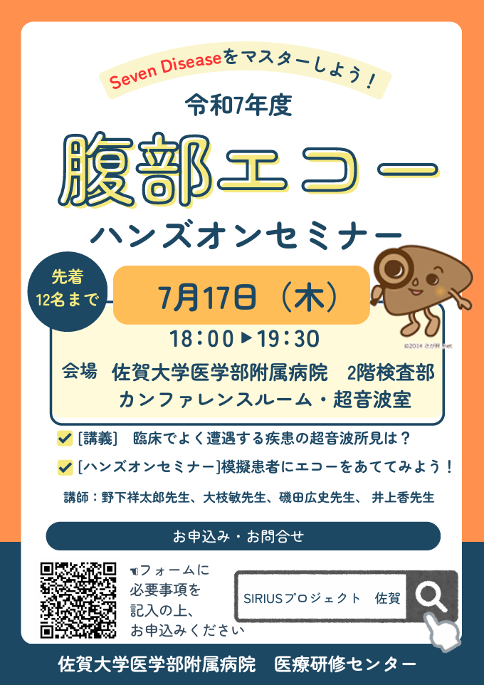 腹部エコーは、簡便かつ低侵襲で、リアルタイムに画像が得られる、腹部領域における重要な検査のひとつです。一方で、施行者によって技術や知識、診断能力の差が出るのも事実です。本セミナーではプローブの当て方等の腹部エコーの基本から、腹部臓器の正常所見、臨床でよく遭遇する腹部領域疾患のエコー所見のポイント等を解説します。実際に模擬患者に腹部エコーを行い、腹部臓器を描出してみましょう。正常所見をきちんと理解することは、異常所見の理解にもつながります。皆さんの参加をお待ちしております!